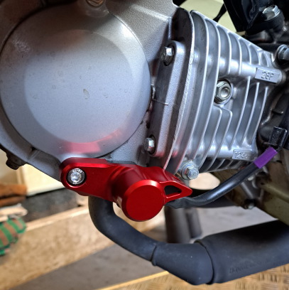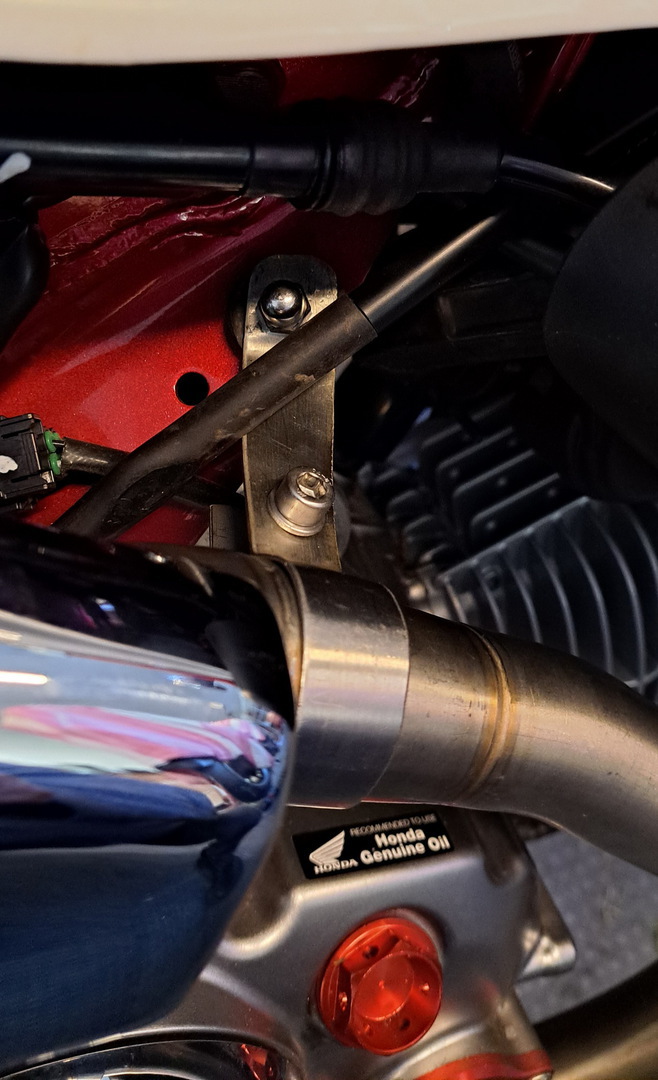Der Krümmer der Akrapovic-Auspuffanlage verschmort den Kupplungszug. Da musste eine zusätzliche Halterung her, die den Krümmer auf Distanz hält!