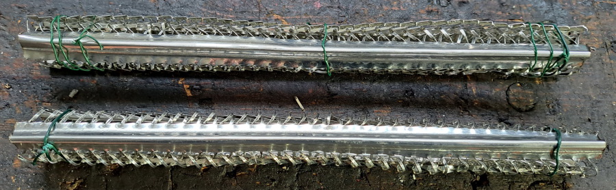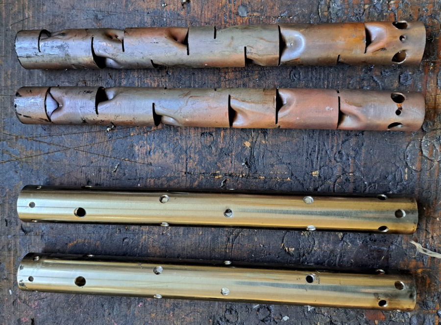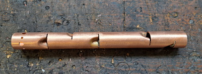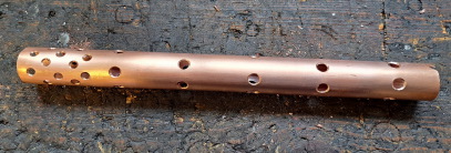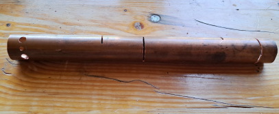 Im Abstand von 40 mm habe ich das Kupferrohr eingesägt, dann glühend gemacht und mit einem Körner die Taschen eingeschlagen. 6 Mal und jeweils um ca. 90° verdreht.