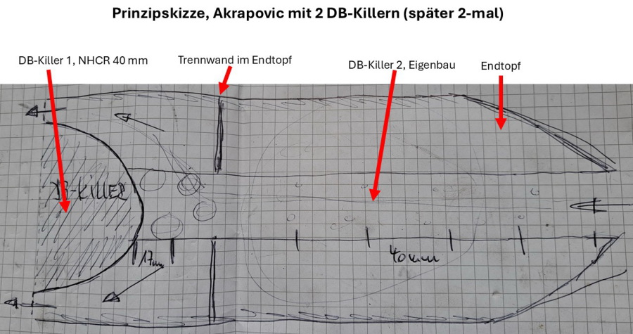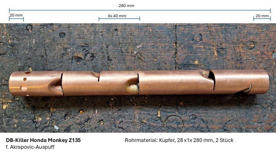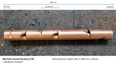 Ich habe mir zwei Stücke Auspuff-Lochrohr besorgt, gab es in den Maßen 26 x 300 mm. Stück 6 Euro. Sind im Zulauf und sollen dann als DB-Killer arbeiten!