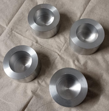 Ich brauchte also neue Deckel für die Endtöpfe, zuvor DB-Killer genannt! Ein Stück passendes Alu habe ich im Internet gefunden und jemanden, der mir daraus die abgebildeten 4 Deckel dreht (davon 2 für spätere Versuche, falls notwendig!). Über die damit verbundenen Kosten decke ich hier mal den Mantel des Schweigens!