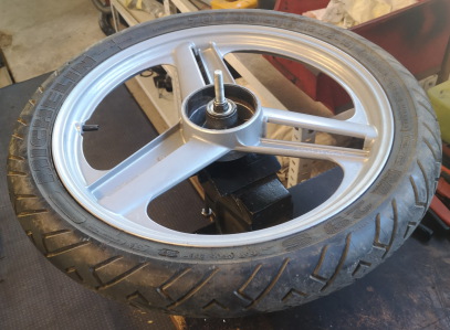 Weil die alten Reifen wirklich nicht mehr brauchbar waren, habe ich der Mofel einen Satz neue (chinesische) Reifen mit Schläuchen spendiert. 50 Euro!
